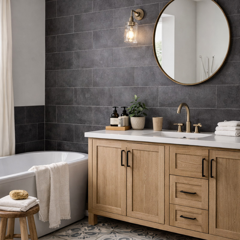 A modern hatás érdekében javasoljuk az antracit vagy sötétszürke fugázót, amely belesimul a csempe színébe. Ha hangsúlyozni szeretné a téglalap alakú kiosztást, választhat világosszürke fugát is, ami kiemeli a lapok kontúrjait.
