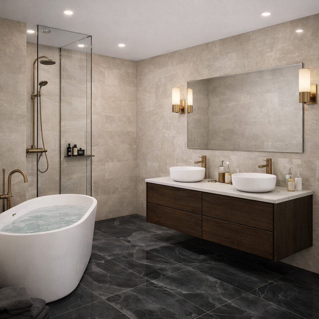 A rektifikált (RT) lapok széleit a gyártás végén milliméter pontosra csiszolják. Ez teszi lehetővé a rendkívül keskeny, akár 2 mm-es fugázást. Ennek köszönhetően a 60x120 cm-es óriáslapok szinte összefüggő felületet alkotnak, ami tágítja a teret és minimalizálja a fuga láthatóságát a drámai fekete márványmintázat között.
