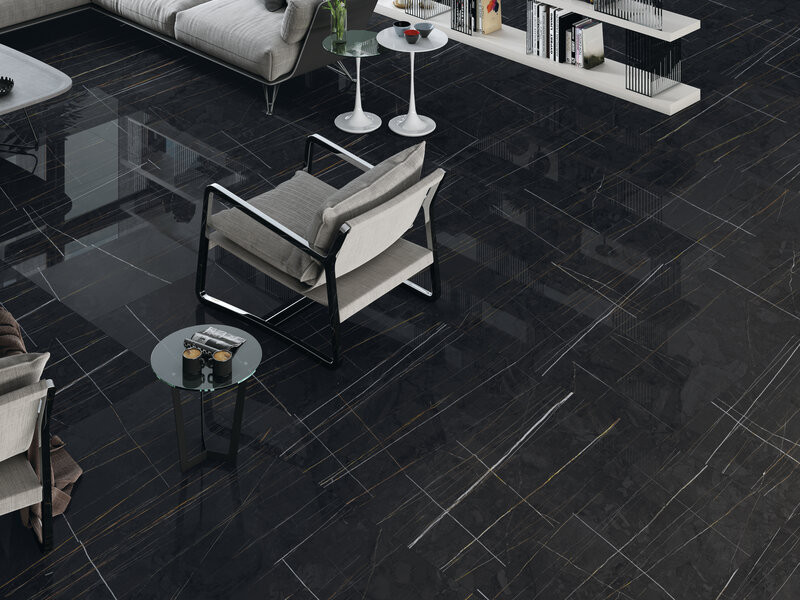A Sahara Noir Pulido elegáns, magasfényű burkolat lenyűgöző kontrasztjaival azonnal luxus érzetet kelt. Fekete alapszíne aranyló és fehér erezetekkel időtlen, exkluzív megjelenést biztosít minden térben.