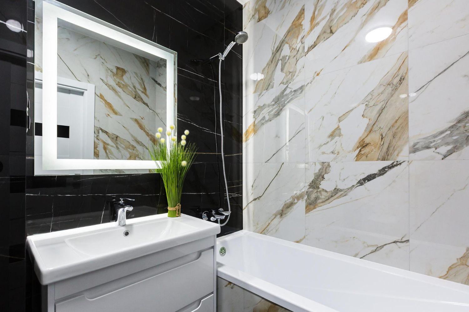 Fehér–fekete, világos–sötét, fényes–matt párosítások: a karakteres, egyedi fürdőszoba titka.